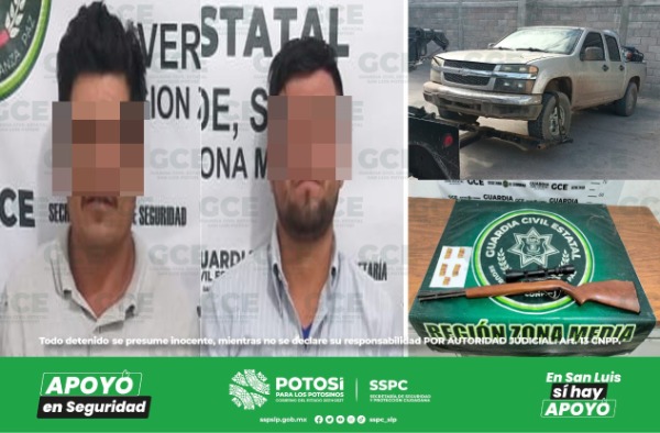 Trabajos de inteligencia desplegados dentro del Plan Integral de Seguridad, permitieron la detención de dos objetivos criminales en el municipio de Rioverde y el aseguramiento de una camioneta hurtada, con cartuchos útiles en su interior, en el municipio de Vanegas, lo anterior fue puesto a disposición de las autoridades correspondientes por parte de la Guardia Civil Estatal (GCE).