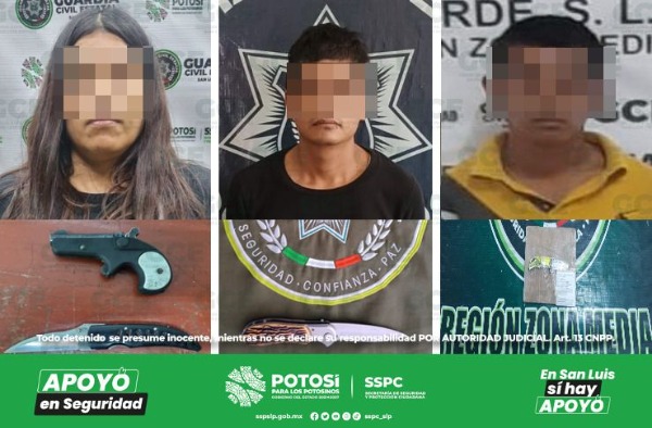 Agentes de la Guardia Civil Estatal (GCE) detuvieron a María "N" de 36 años de edad, con una navaja, tras ser detectada en la colonia San José de Buena Vista, en la capital potosina; en la colonia Nelly, del municipio de Ciudad Vales, Raúl "N" de 27 años fue detenido con un cuchillo de 12 centímetros.