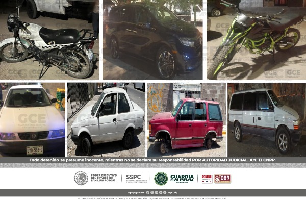 Mediante los operativos de seguridad, efectuados por la Guardia Civil Estatal (GCE), siete unidades que tenían reporte de robo fueron aseguradas en la capital potosina, así como en los municipios de Soledad de Graciano Sánchez y Santa María del Río.