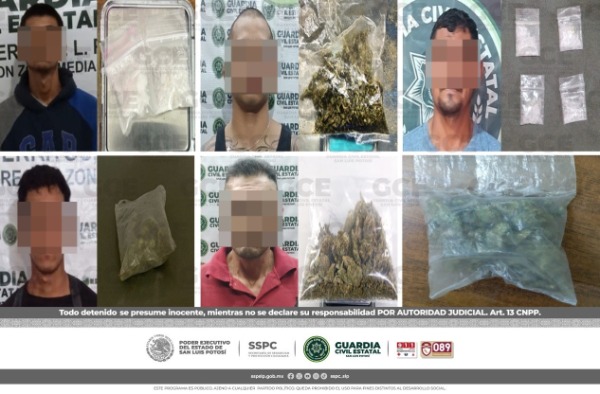 En la capital potosina se detuvo a: Jesús "N" de 20 años de edad, ubicado en el Barrio de Tequisquiapan, con una dosis de marihuana; Rodrigo "N" de 18 años, quedó detenido con una bolsa con marihuana, en la colonia Morales; también en la colonia Las Mercedes, Carlos "N" de 23 años, fue asegurado con una dosis de "cristal"; sobre la colonia Satélite, Víctor "N" de 35 años, quedó detenido con una dosis de "cristal". También en la colonia Santa Fe, Rogelio "N" de 40 años de edad, fue detenido con una dosis de marihuana.