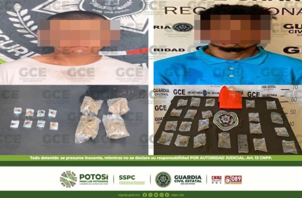 En el marco de las acciones de seguridad implementadas con el objetivo de preservar la paz, así como el combate contra el narcomenudeo, elementos de la Guardia Civil Estatal detuvieron a dos presuntos narcomenudistas en distintas acciones implementadas en el territorio potosino.