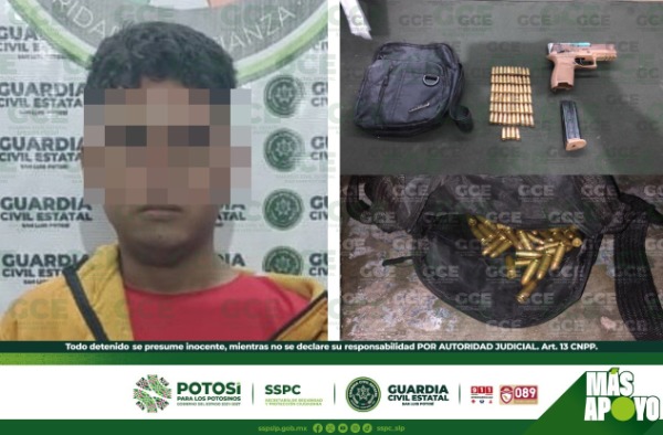Luego de contralarse e implementarse los protocolos de actuación debidos, se detuvo a un joven, identificado como Duvan "N" de 20 años de edad a quien se le aseguró un arma de fuego calibre 9 milímetros, una mariconera y 52 cartuchos útiles.