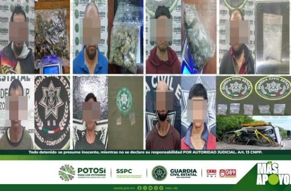 Oficiales de la GCE detuvieron en la capital potosina a: Alejandro "N" de 27 años de edad, en la colonia Las Piñas, luego de asegurarle una bolsa con marihuana; Uriel "N" de 19 años, fue detenido con una dosis de marihuana, en la colonia Simón Díaz; Missael "N" de 43 años, quedó detenido en la Central de Abastos, con una dosis de marihuana; mientras que en la colonia División del Norte, Eduardo "N" de 33 años, quedó detenido con una dosis de "cristal".