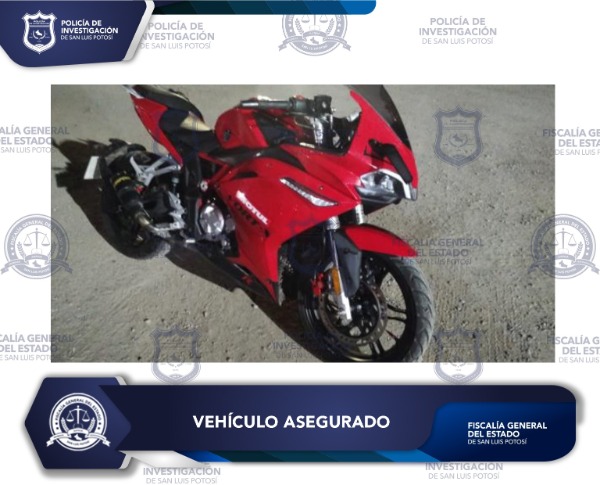 Su aseguramiento se realizó en el estacionamiento de una plaza comercial ubicada al oriente de la ciudad de San Luis Potosí, quedando a disposición de un Agente del Ministerio Público al igual que la motocicleta, para continuar con el proceso conducente, deslindar responsabilidades y el automotor ser devuelto su legítimo dueño.