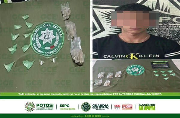 Continuando con los operativos de seguridad, en el municipio de Matehuala, efectivos de la GCE detuvieron a David "N" de 22 años de edad, en la colonia San Francisco, en donde fue sorprendido con siete dosis de la droga sintética conocida como "cristal" y cinco bolsas con marihuana. Derivado de las labores de inteligencia, la corporación estatal indicó que el detenido podría estar vinculado a una red de narcomenudeo, para una organización delictiva.