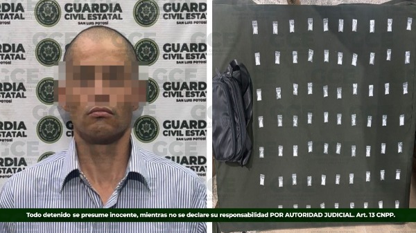 Se le aseguraron 69 dosis de droga conocida como "cristal" en la colonia Jacarandas de la capital potosina, donde presuntamente se dedicaba a distribuir sustancias ilícitas a vendedores.