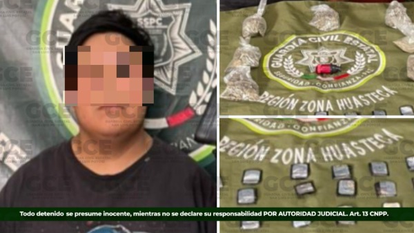 Por otra parte, en el municipio de Xilitla, fue detenido José Gabriel "N", de 22 años de edad, presuntamente vinculado a actividades de distribución de droga, a quien se le aseguraron diversas dosis de sustancias con características de marihuana y "cristal".
