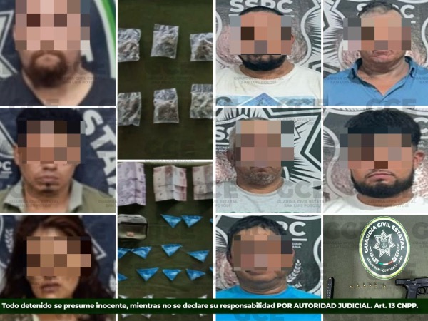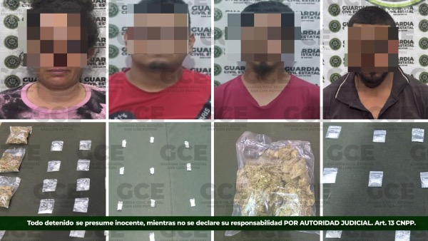 En la capital potosina, derivado de los recorridos operativos, la GCE detuvo a Blanca "N", de 35 años, en la colonia Vergel, en posesión de diversas dosis de sustancias con características de "cristal", marihuana y cocaína. Asimismo, en distintos puntos de la ciudad fueron asegurados Jesús "N", de 32 años, y Raúl "N", de 34 años, presuntamente vinculados al narcomenudeo.