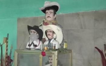 Una luz tenue ilumina la efigie de Jesús Malverde, patrono de los pobres y los necesitados, objeto de culto en el narcotráfico de cuna sinaloense, como Joaquín Guzmán. Supuesto artífice de curas, limpias y amarres, este personaje es tan sólo uno de los tantos que alberga la controvertida Catedral de la Muerte en Pachuca.