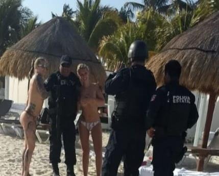 El fin de semana se viralizaron en redes sociales unas fotografías, en donde se ve a tres elementos de la policía estatal posando con un par de turistas extranjeras las cuales disfrutaban de la playa sin alguna prenda que cubriera sus pechos en Cancún, Quintana Roo.