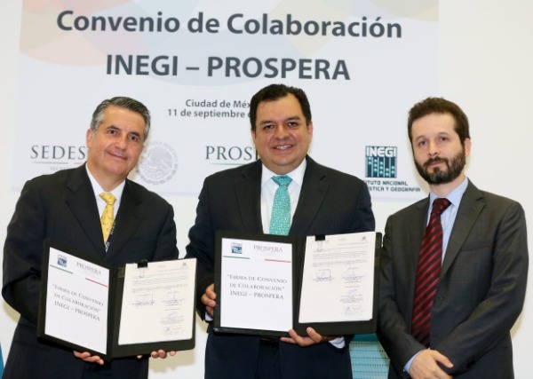 El Coordinador Nacional de PROSPERA, Jaime Gutiérrez Casas, y Édgar Vielma Orozco, Director General de Estadísticas Sociodemográficas firmaron el documento, teniendo como testigo de honor a Julio A. Santaella, presidente del INEGI.