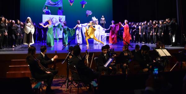 Como parte de los festejos de aniversario se presentó el Ensamble Artístico Cultural cargo de las escuelas estatales de arte plásticas música teatro y danza con las puesta en escena In situ Origen Musas Legislación a la Educación Huelguistas y Arte y Educación