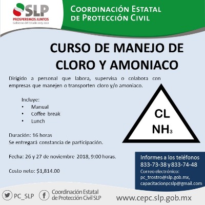 • La Coordinación Estatal de Protección Civil emitió convocatoria para un curso de capacitación dirigida a profesionales y empresas que manejan cloro o amoniaco en sus procesos.