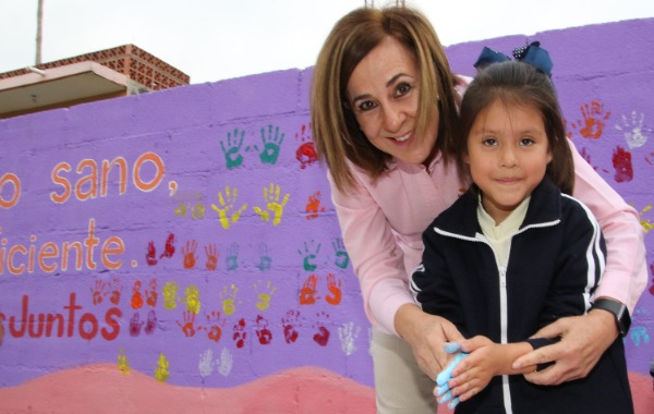 Asimismo acompañada por niñas y niños reinició la campaña Por Una Alimentación Sana, Variada y Suficiente, con la pinta de huellas en una barda.