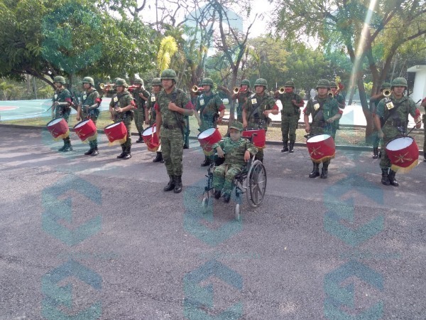 Con mielomeningocele, pie equino varo e hidrocefalia desde nacimiento, además de una luxación de caderas a los tres años, el pequeño Jesús Eduardo Ponce Bueno se convirtió en Solado Por un Día, donde convivió una mañana en las instalaciones del 36 Batallón de Infantería tras ser elegid, tomó pase de lista, observó las diversas actividades que realizan día a día los soldados y se le obsequió una réplica a escala de una camioneta de madera del ejército mexicano.