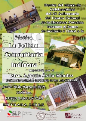 Continuando con las actividades en el marco de la celebración del 25 aniversario del Centro Cultural de la Huasteca Potosina, este jueves 28 de marzo del 2019, a las 19:00 horas en el museo Tamuantzán se presentará la plática titulada "La Policía Comunitaria Indígena", a cargo del maestro Agustín Ávila Méndez, profesor investigador de El Colegio de San Luis (COLSAN).