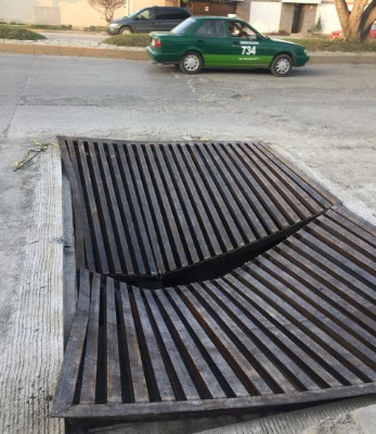 Las rejillas del dren pluvial que recién fueron colocados en el bulevar México - Laredo están colapsados, exponiendo la integridad de los peatones y conductores de vehículos.