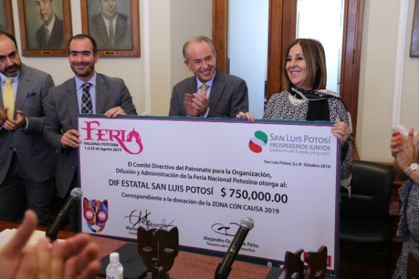 En el marco de la presentación de resultados de la edición 2019 de la Feria Nacional Potosina (Fenapo), en reunión encabezada por el Gobernador del Estado Juan Manuel Carreras López, la Presidenta de la Junta Directiva del Sistema Estatal para el Desarrollo Integral de la Familia (DIF), Lorena Valle Rodríguez, recibió el donativo por parte de la Fenapo.