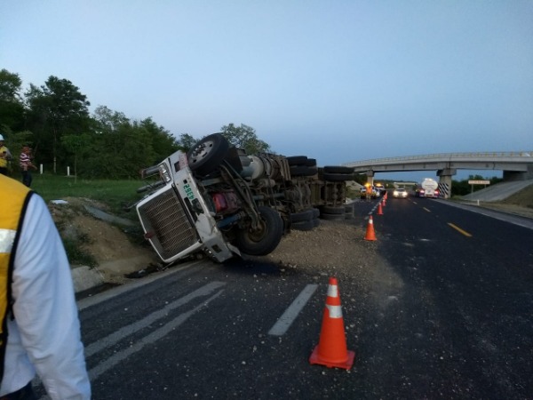 Esta tarde se registró la volcadura de un tráiler marca Kenworth color blanco, en el kilómetro 73+500 del libramiento Valles-Tamuín, en el tramo La Calera a La Pitahaya.
