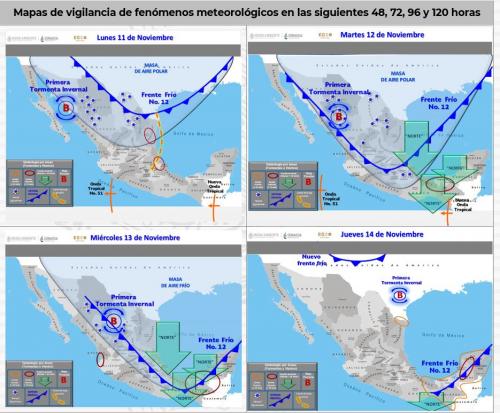 • De acuerdo con los pronósticos para las próximas horas, se prevé que el intenso Frente Frío No. 12 y su masa de aire polar asociada ingresará sobre los estados del norte y noreste de México, mientras que la primera tormenta invernal de la temporada se ubicará sobre el noroeste del país. Por otra parte, la onda tropical No. 51 se desplazará sobre el occidente del territorio nacional y se prevé el ingreso de la onda tropical No. 52 a la Península de Yucatán, estos sistemas ocasionaran potencial de lluvias en dichas regiones.