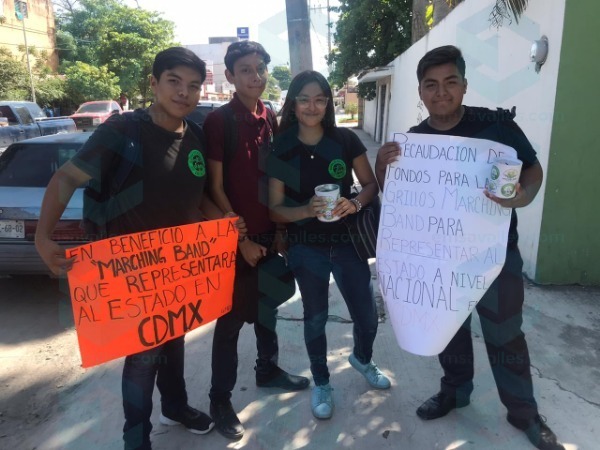 Estudiantes del CBTIS 46 de Ciudad Valles integrantes de la "Marching Band" realizan un boteo por las principales calles de la ciudad para obtener recursos y solventar los gastos de la competencia que se llevará a cabo en la Ciudad de México, donde representarán al estado en el encuentro nacional de bandas.