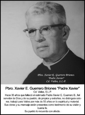 Hace 35 años, el 7 de diciembre de 1984 falleció el Padre Xavier Enrique Guerrero, aunque su gran labor permanece grabada entre los vallenses por sus obras, sus acciones y el legado que dejó, y es que el sacerdote a quien se le recuerda vestido con su sotana impulsaba la fe católica, pero al mismo tiempo el desarrollo de un pueblo como Ciudad Valles en la década de los 30´s.