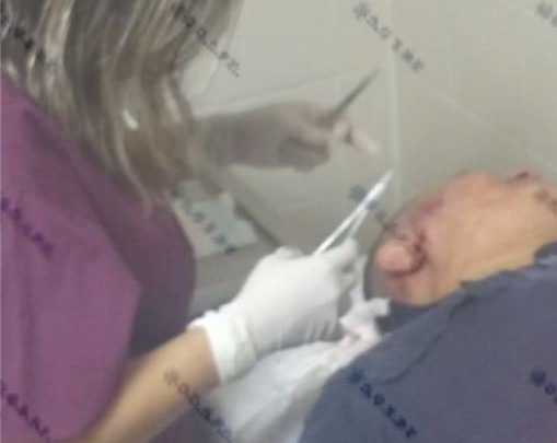 Al momento que el policía estatal solicitaba el apoyo de sus compañeros, el sujeto sacó de su vestimenta un cuchillo amenazando al elemento, al momento que le arrebató el radio y lo lanzó al piso, en el forcejeo el sujeto mordió al policía en la cara, causándole lesiones en oreja y pómulo, así mismo le golpeo en los ojos.