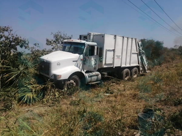 Un camión recolector de basura propiedad del ayuntamiento se salió del camino y chocó contra la maleza.