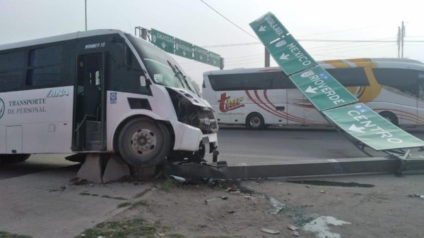 Este domingo un chofer de camión de transporte de personal, se impactó contra una estructura metálica gigante que servía de señalética informativa.