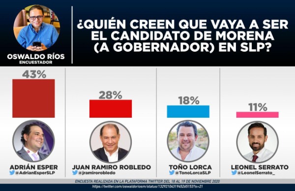En una encuesta realizada por el analista político y encuestador Oswaldo Ríos, nombra a Adrián Esper Cárdenas, como el virtual ganador para ocupar la candidatura de Morena a la gubernatura en el 2021.
