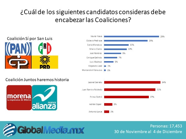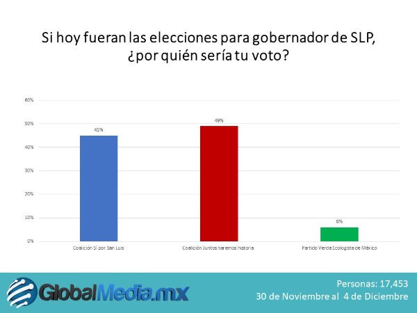 En una encuesta realizada del 30 de noviembre al 4 de diciembre para la elección de gobernador del estado de San Luis Potosí Los resultados arrojados colocan a la coalición "Juntos haremos historia" conformada por Morena y PANAL 49%, cuatro puntos por encima de la coalición "Sí por SLP" formada por PAN, PRI, PRD y Conciencia Popular.