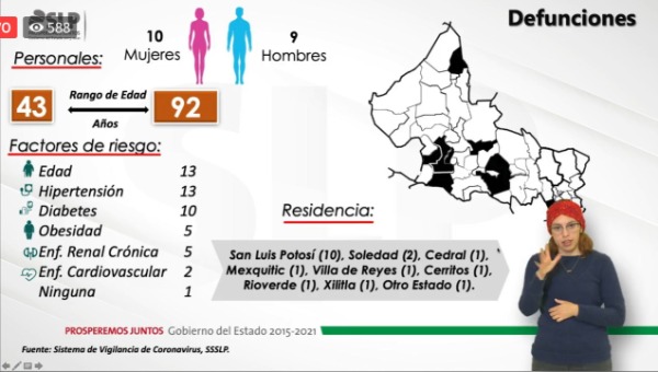 De las nuevas 19 defunciones, se dio a conocer que las víctimas corresponden a 10 mujeres y mueve hombres, con un rango de edad de 43 a 92 años, con residencia en los municipios de la capital (10); Soledad (2); Cedral (1); Mexquitic (1); Villa de Reyes (1); Rioverde (1); Xilitla (1); y otro estado (1); mismas que presentaban como antecedentes factores de riesgo de edad (13); hipertensión (13); diabetes (10); obesidad (5); enfermedad renal crónica (5); enfermedad cardiovascular (2); ninguna (1).