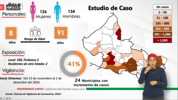 Sobre los nuevos 260 casos positivos a coronavirus, se detalló que se trata de 126 mujeres y 134 hombres, en un rango de edad de 8 a 91 años; mismos que tienen como residencia 195 en la capital; 17 en Soledad; 10 en Matehuala; un caso en los municipios de Cedral y Moctezuma; cuatro en Santa María del Río y Mexquitic; dos en Salinas, Villa de Reyes y Zaragoza; uno en Villa de Arriaga; dos en Ciudad Fernández; uno en los municipios de Rioverde, Cerritos, Ciudad del Maíz y San Ciro de Acosta; uno en Tamasopo; dos en Tamuín; tres en Tamazunchale; dos en Matlapa y Xilitla; uno en Axtla; uno en Coxcatlán y Tampamolón; dos de otros estados.