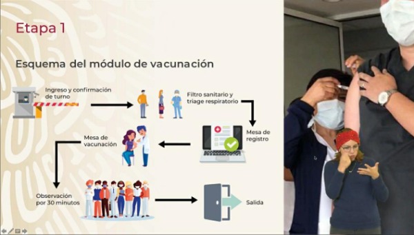 Asimismo, en cuanto al esquema del módulo de vacunación, este será un protocolo de seis pasos; el primero, el ingreso y confirmación de turno; el segundo el filtro sanitario y el triage respiratorio; el tercer paso, la mesa de registro; el cuarto paso, la mesa de vacunación; el quinto paso, la observación por 30 minutos y finalmente el sexto paso, la salida de las personas vacunadas.