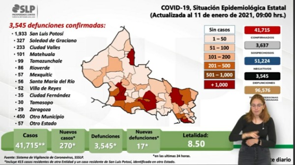 Sobre los nuevos 270 casos positivos a coronavirus, se detalló que se trata de 141 mujeres y 129 hombres, en un rango de edad de 8 a 92 años; mismos que tienen como residencia 159 en la capital; 24 en Soledad; 25 en Matehuala; uno en Cedral; siete en Santa María del Río; cinco en Salinas; dos en Villa de Reyes; uno en Villa de Arista, Cerro de San Pedro y Tierra Nueva; dos en Ciudad Fernández; uno en Rioverde y Cerritos; 18 en Ciudad Valles; uno en Tamasopo, Tamuín y El Naranjo; 10 en Tamazunchale; tres en Axtla; dos en Tanquián y cuatro de otro estado.