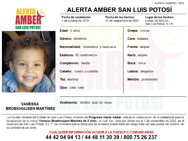 La menor de nombre Vanessa Broekhuijsen Martínez fue vista por última vez el día 1 de septiembre de 2022, luego de que fue sustraída por un familiar que no cuenta con la custodia de la misma.