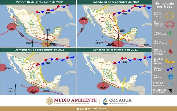 El sábado, la onda tropical Núm. 26 recorrerá lentamente el oriente, centro y sur del país, asociada con una zona de baja presión con probabilidad de desarrollo ciclónico que podría dar origen el domingo a un ciclón tropical al sur de las costas de Guerrero, desplazándose de manera paralela a las costas de Michoacán, Colima y Jalisco en el transcurso del lunes, manteniendo el temporal de lluvias intensas a puntuales torrenciales durante su recorrido en zonas de Chiapas, Tabasco, Veracruz, Puebla, Oaxaca, Guerrero, Michoacán, Jalisco y Colima, además de lluvias fuertes a muy fuertes en el oriente, centro y occidente de la República Mexicana. Asimismo, se prevén rachas fuertes de viento y oleaje elevado en costas de Oaxaca, Guerrero, Michoacán, Colima y Jalisco.