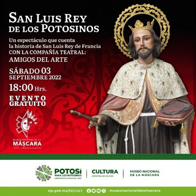 La Secretaría de Cultura de San Luis Potosí, invita al público en general a la presentación del espectáculo "San Luis Rey de los potosinos" que se llevará a cabo este sábado 3 de septiembre a las 18:00 horas en el Museo Nacional de la Máscara, con entrada libre.