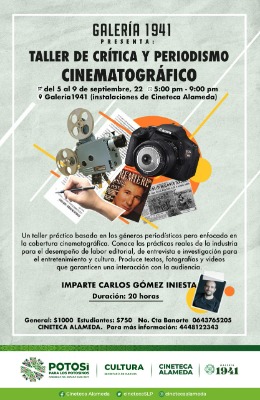 Gobierno del Estado, a través de la Secretaría de Cultura de San Luis Potosí, invita al público interesado a participar en el Taller de crítica y periodismo cinematográfico que impartirá el reconocido investigador, crítico y periodista cinematográfico Carlos Gómez Iniesta, en Cineteca Alameda, del 5 al 9 de septiembre en un horario de 17:00 a 21:00 horas, con una cuota de recuperación de $1,000.00 para público en general y $750.00 para estudiantes.