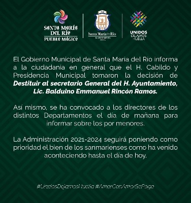 A través de sus redes sociales oficiales, el H. Ayuntamiento de Santa María del Río, dio a conocer que de manera unánime, el Cabildo decidió destituir de su encargo como Secretario General del Municipio, Balduino Emmanuel Rincón Ramos.