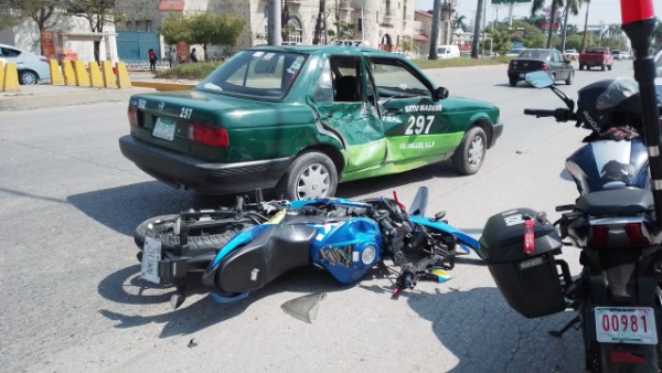 Supuestamente tuvo la culpa el chofer del taxi con número económico 297 del sitio Madero, quien circulaba por calle Frontera y quiso cruzar el bulevar, pero no tuvo precaución y le cortó la circulación al joven, quien conducía una motocicleta deportiva marca Suzuki color azul.