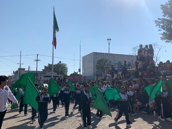Instituciones educativas, entre ellas la Unidad Regional de Servicios Educativos Huasteca Norte (URSEHN) y el Centro de Seguridad Social del IMSS, desfilaron con entusiasmo, realizando tablas rítmicas y ondeando las banderas tricolor.