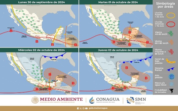 Finalmente, la Conagua y el Servicio Meteorológico Nacional exhortan a la población a mantenerse informada sobre las condiciones meteorológicas mediante las páginas de internet www.gob.mx/conagua y http://smn.conagua.gob.mx, en las cuentas de X @conagua_mx y @conagua_clima y de Facebook www.facebook.com/conaguamx, así como en la aplicación para dispositivos móviles ConaguaClima, donde se puede consultar el pronóstico por municipios.