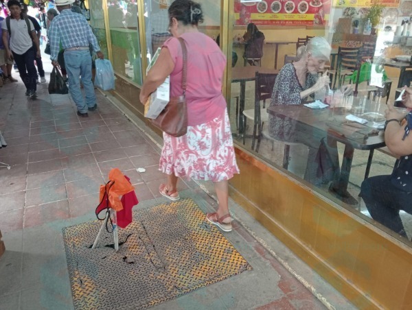 Un registro con años de antigüedad se ha convertido en un riesgo latente para peatones y transeúntes en la esquina de la calle Porfirio Díaz con calle Hidalgo, junto a la tienda Arteli.