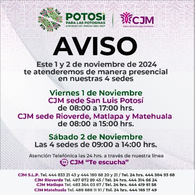 Acorde al trabajo del Gobernador del Estado, Ricardo Gallardo Cardona, a favor de la igualdad, la atención a las potosinas y la cero tolerancia a la violencia contra las mujeres, el CJM brindará atención el viernes 1 de noviembre de 8:00 a 17:00 horas en la sede de la capital potosina, y de 8:00 a 15:00 horas en las sedes de Matehuala, Rioverde y Matlapa; mientras que el sábado 2 de noviembre, trabajará en un horario de 9:00 a 14:00 horas, en todas las sedes.