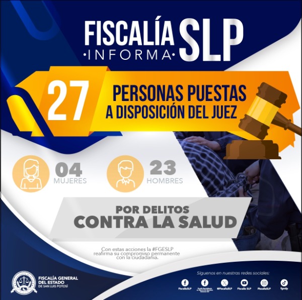 Cuatro mujeres y 23 hombres enfrentarán el delito de contra la salud, luego que fueron puestos a disposición de la Fiscalía General del Estado de San Luis Potosí (FGESLP) en las últimas 48 horas.
