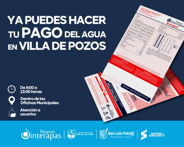 En el caso de la caja receptora de pagos, realiza cobros en efectivo y con tarjetas bancarias; en caso de no poder acudir personalmente, los usuarios de Villa de Pozos también podrán utilizar la aplicación InterAPPas Móvil, en la que se puede consultar el historial de pagos y descargar el recibo de pago.