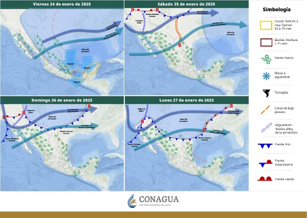 Durante el sábado y domingo, un nuevo frente frío, en interacción con una vaguada polar y las corrientes en chorro polar y subtropical, se aproximará a la frontera noroeste y norte del territorio nacional, por lo que se prevén vientos fuertes a intensos en el golfo de California y con posibles tolvaneras en zonas de Baja California, Sonora, Chihuahua y Durango; así como lluvias y chubascos en dichas entidades.