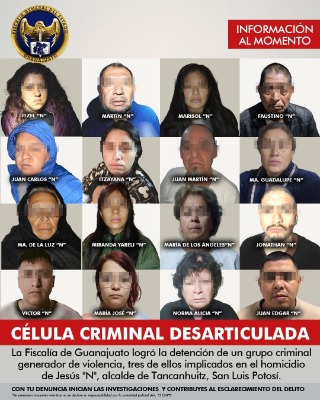 La Fiscalía General del Estado se Guanajuato, anunció la detención de una célula criminal de 16 perdonas, hombres y mujeres en los municipios de Celaya y Villagrán, los cuales, presuntamente estarían implicados en la ejecución del Presidente Municipal de Tancanhuitz, el motenista, Jesús Eduardo Franco Larraga, un colaborador y dos de sus escoltas, hechos ocurridos en la localidad de Palmira Viejo, perteneciente a Tancanhuitz, el pasado 15 de diciembre de 2024, y que conmocionó a todo el estado potosino.