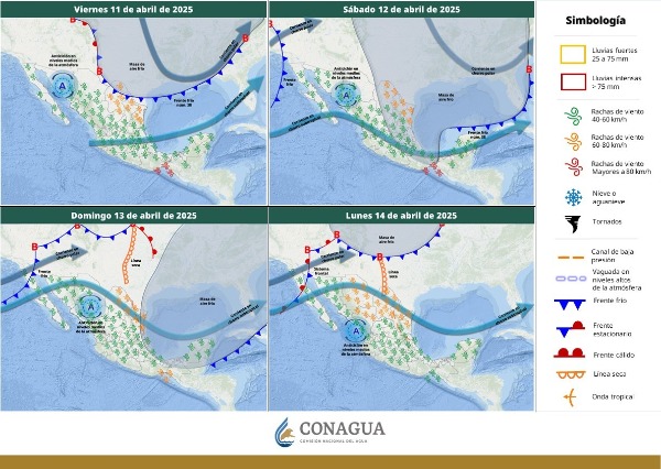Finalmente, la Conagua y el Servicio Meteorológico Nacional exhortan a la población a mantenerse informada sobre las condiciones meteorológicas mediante las páginas de internet www.gob.mx/conagua y http://smn.conagua.gob.mx, en las cuentas de X @conagua_mx y @conagua_clima y de Facebook www.facebook.com/conaguamx, así como en la aplicación para dispositivos móviles ConaguaClima, donde se puede consultar el pronóstico por municipios.